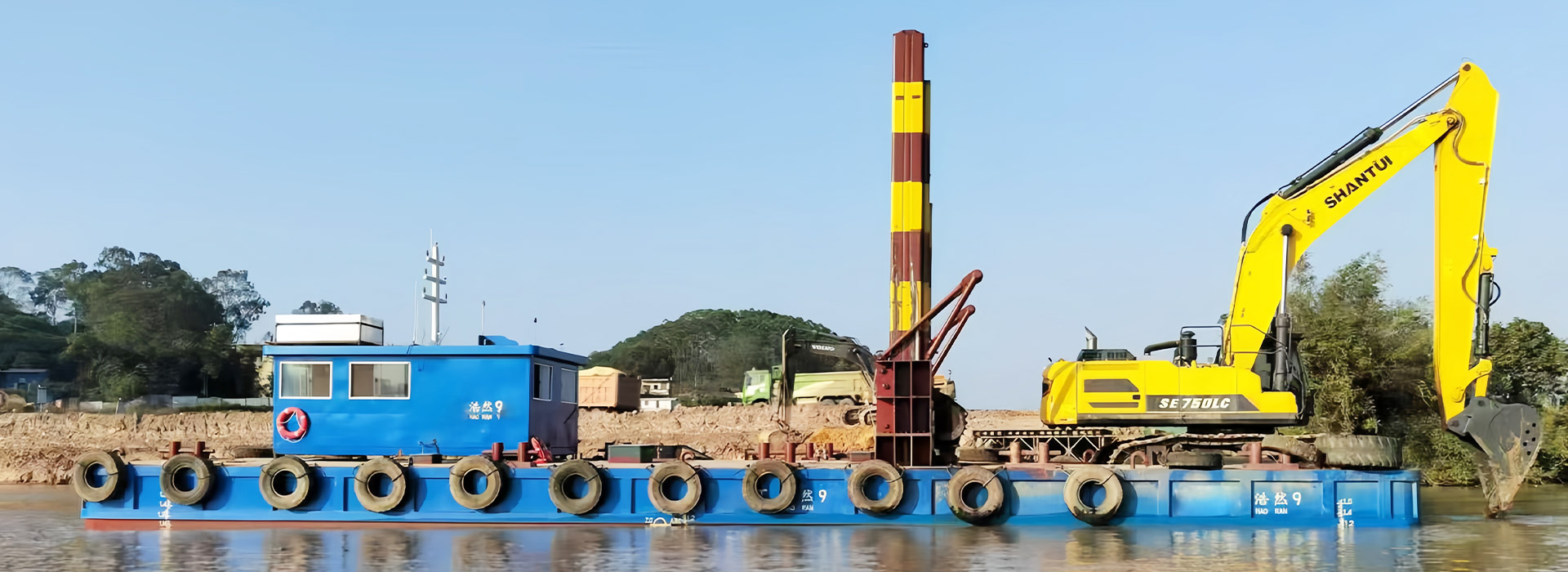 2、施工平臺穩(wěn)性強(qiáng),方便挖掘機(jī)在深水區(qū)施工作業(yè)。并且,平臺自帶航行動力,便于水上調(diào)遣。